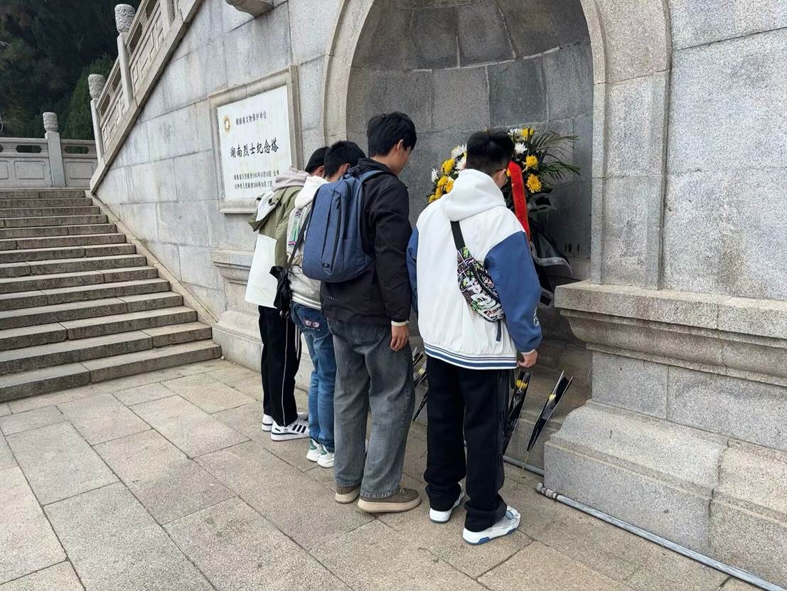 同学们进入烈士公园的烈士纪念塔进行参观。在展馆内,一幅幅珍贵的历史照片、一件件革命文物生动还原了革命先烈抛头颅、洒热血的感人事迹。同学们驻足于英雄的书信和日记前,字里行间流露的家国情怀令大家感慨万千。一封封写满对国家坚定信念的遗书让许多同学热泪盈眶,深切感受到今日的和平生活来之不易。同学们了解了多位湖南籍革命英雄的英勇事迹,黄兴、蔡和森等先烈为了民族解放不畏艰险、舍生忘死的革命精神深深触动了在场的每一位同学。